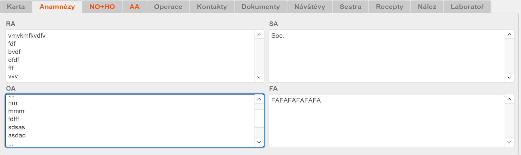Záložka Anamnézy obsahuje několik víceřádkových polí pro zápis různých anamnéz. Typicky OA-osobní anamnézy, RA-rodinná anamnéza, SA-sociální anamnéza nebo FA-farmaceutická anamnéza. Některé typy karet pacienta obsahují pozměněnou či rozšířenou sadu anamnéz.