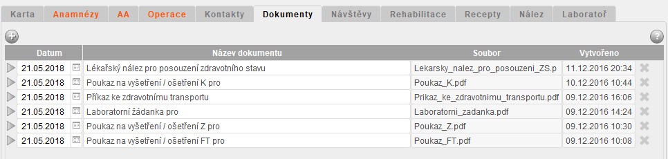 Záložka Dokumenty slouží pro ukládání libovolných souborů. Může jít o textové dokumenty formátu TXT, DOC, PDF a další. Může jít i o obrazové dokumenty typu TIF, JPG, PNG, GIF a další. Do dokumentů si můžete naskenovat a uložit různé lékařské zprávy a posudky, nebo rentgenové či jiné snímky.
