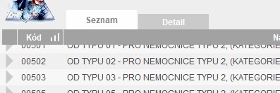 Pro přepnutí do detailu lze rovněž použít záložku `Detail` nad seznamem, jak ukazuje obrázek výše. Pokud seznam nemá žádný detail, chybí jak šipka před záznamem, tak záložka `Detail` nad seznamem. V takovém případě lze záznamy v seznamu editovat přímo. Tato možnost je využita jen u malých číselníků a jiných malých tabulek.
