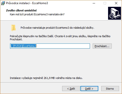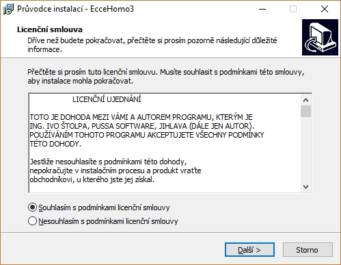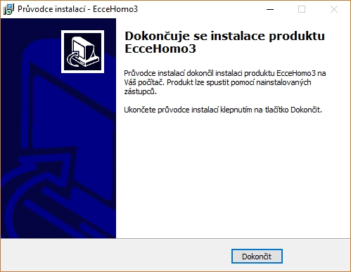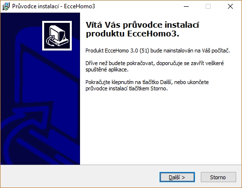 Program EcceHomo se instaluje pouze v nesíťové verzi na operačním systému Windows. Instalace probíhá standardním instalačním procesem. Po spuštění instalačního souboru se zobrazí následující okno: