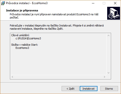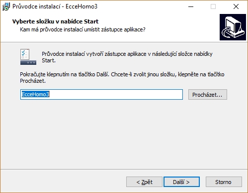 Výchozí složkou v nabídce Start je EcceHomo 3. Pokud k tomu nemáte zvláštní důvod, ponechte výchozí hodnotu a stiskněte tlačítko Další. Zobrazí se okno se souhrnnými informacemi o vašich volbách: